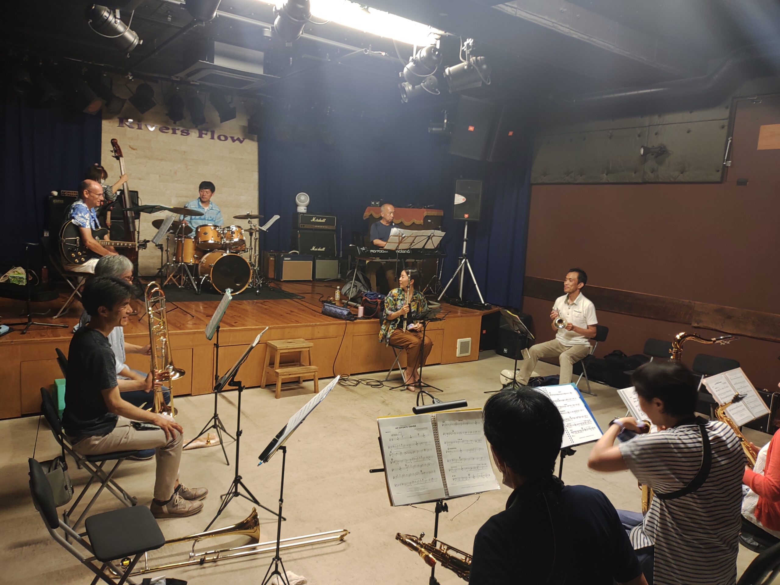 本日の参加は、フルート1人、アルトサックス3人、テナーサックス2人、トランペット2人、トロンボーン3人、ギター、ピアノ、ベース、ドラムでした。