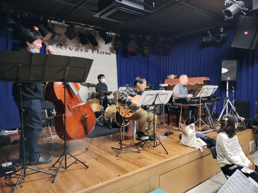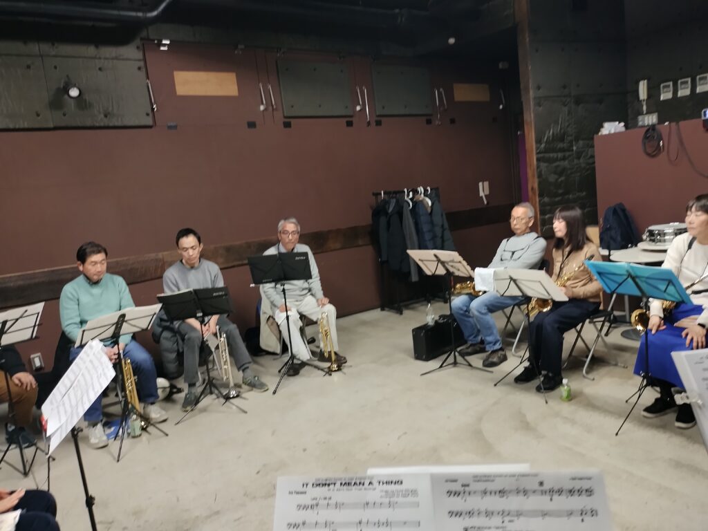 2025年12月6日レッスン 活動記録 2025.12.13 今回は石井慎太郎先生のレッスンでした。5月竹林コンサートに向けた候補曲4曲をレッスンいただきました。 本日の参加は、フルート1人、アルトサックス2人、テナーサックス1人、バリトンサックス、トランペット3人、トロンボーン3人、ピアノ、ギター、ドラム、ベースでした。 ドラムのYさんに入会いただきました。フルート1名募集中です。 次回はアンサンブル大会&忘年会です。